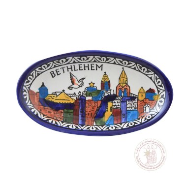 This 17 CM deep oval plate is adorned with an image of Bethlehem. It was made by ceramic artisans from Hebron.
