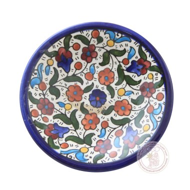 This 18 CM deep bowl is adorned with a multi-colored tulip motif. It was made by ceramic artisans from Hebron.