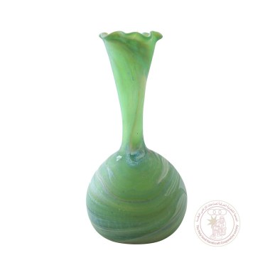 This 22 CM long-necked vase is made of green-colored Phoenician glass and features a fluted rim. It was made by artisans from Hebron.