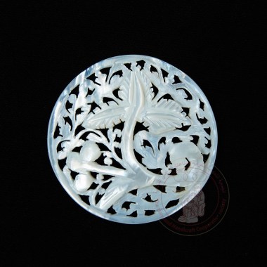This round mother of pearl brooch features a design of a flower, and was made by Bethlehem artisans.