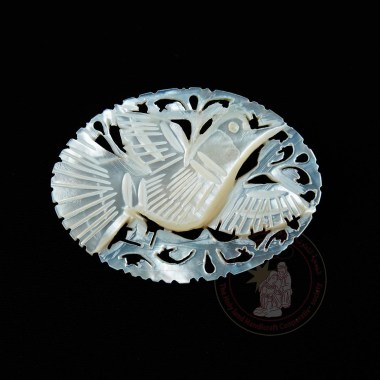 This round mother of pearl brooch features a design of a dove, and was made by Bethlehem artisans.