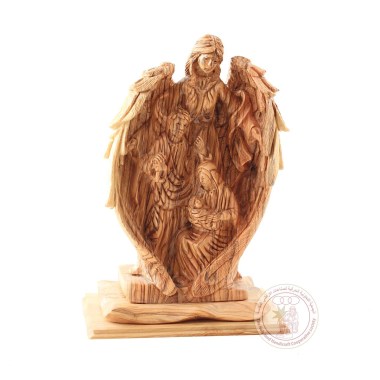 This carved statue depicts an angel protecting the Holy Family at the time of the Nativity. It was carved in Bethlehem from Holy Land olive wood.