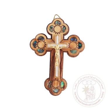 This is an Orthodox crucifix with four inlaid pieces of earth, leaves and incense from the Holy Land, suitable for hanging on a wall. The cross is made of mother of pearl and olive wood by artisans from Bethlehem.