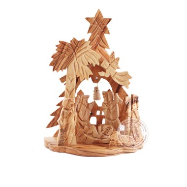 This Nativity creche depicts the Holy Family in the Bethlehem manger, with a small bell tied to a string for a backdrop. It is made in Bethlehem with Holy Land olive wood.