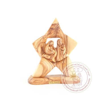 This carving depicts the Holy Family within the Star of Bethlehem. It has smooth, faceless features. It was carved in Bethlehem from Holy Land olive wood.