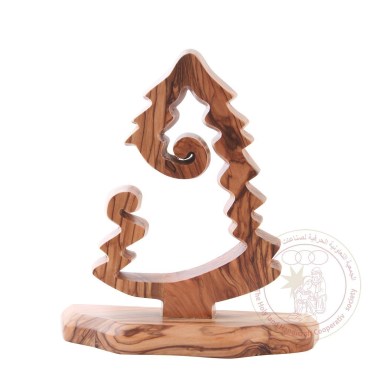This display piece features an abstract depiction of a Christmas tree, and was made from olive wood by Bethlehem artisans.