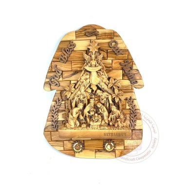 This is an olive wood plaque with the inscription 'God Bless Our Home' and 'Bethlehem', a gypsum relief depicting the Last Supper, and two inlaid incense. Made by Bethlehem artisans.