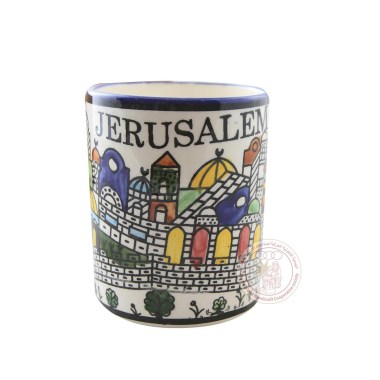 This 8 CM mug is adorned with an image of Jerusalem. It was made by ceramic artisans from Hebron.