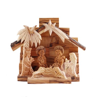 This Nativity creche depicts the Holy Family in the Bethlehem manger, with a magi and shepherd. It is designed as a Christmas tree ornament or a freestanding creche, and is made in Bethlehem with Holy Land olive wood.