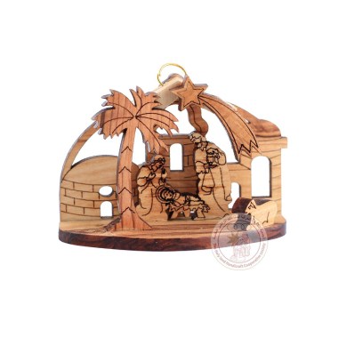 This Nativity creche depicts the Holy Family in the ''Little Town of Bethlehem'', with the backdrop of the Church of the Nativity with the Bethlehem Star over the Holy Family. It is designed as a Christmas tree ornament or a freestanding creche, is laser-cut and is made in Bethlehem with Holy Land olive wood.
