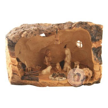 This is a unique Nativity creche set, depicting a more rustic imagining of the Holy Family in the manger. All figures have plain, smooth features. The set is made from Holy Land olive wood. Luke 2:7 ''And she gave birth to her firstborn son and wrapped him in swaddling cloths and laid him in a manger, because there was no place for them in the inn''.