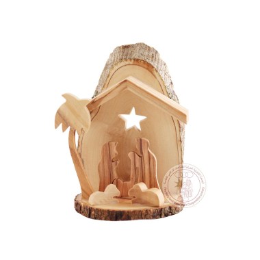 This Nativity creche depicts the Holy Family in the Bethlehem manger, with the Star of Bethlehem as a backdrop. It is designed as a Christmas tree ornament or a freestanding creche, and is made in Bethlehem with Holy Land olive wood.
