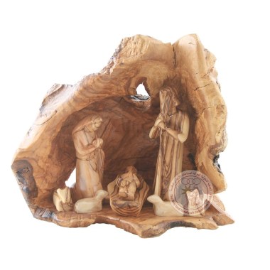This depiction of the Holy Family at the Nativity of Jesus uses the natural rough contours of a olive wood tree to capture the essence of the cave that Christ was born in. All figures have smooth, plain features. The set is made from Holy Land olive wood.