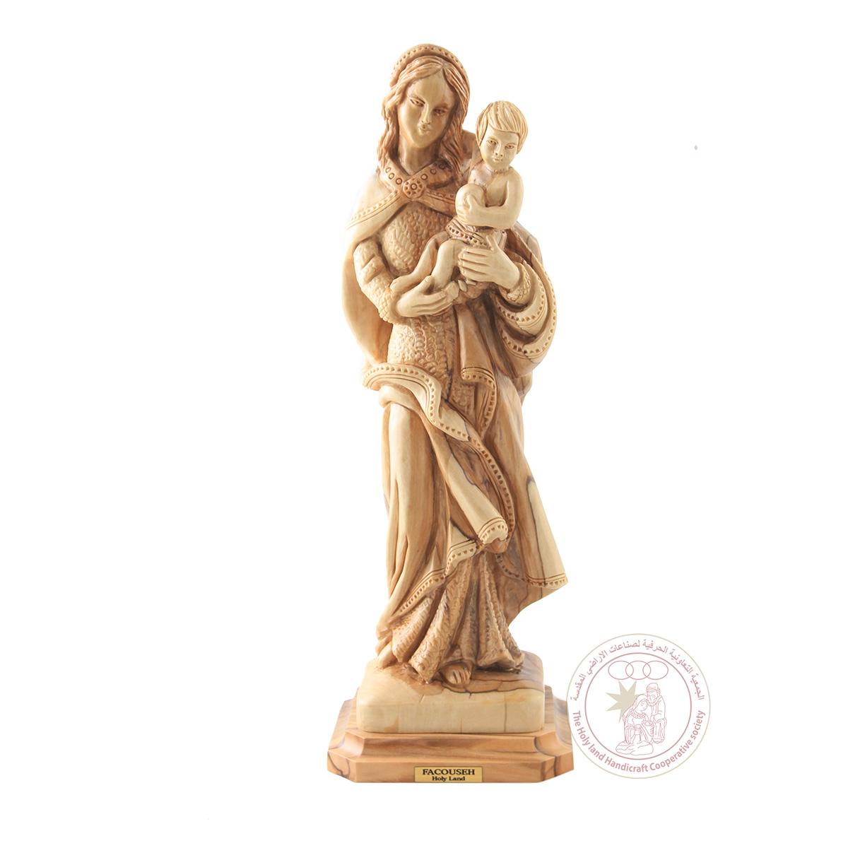 This carved statue depicts the Virgin Mary with the infant Jesus. It was carved in Bethlehem from Holy Land olive wood.