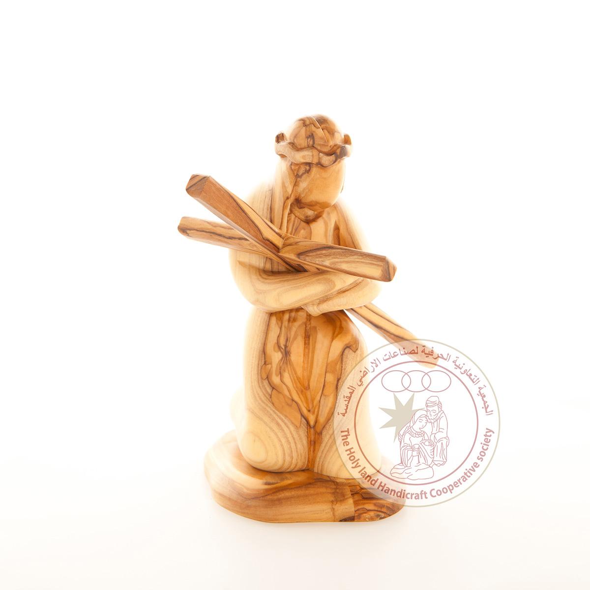 Christ Kneels with His Cross - Smooth Plain Olive Wood Figurine