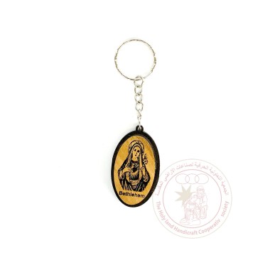 This is a keychain made of olive wood, depicting the Virgin Mary. Made by Bethlehem artisans.