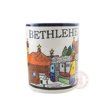 This 10 CM mug is adorned with an image of Jerusalem. It was made by ceramic artisans from Hebron.