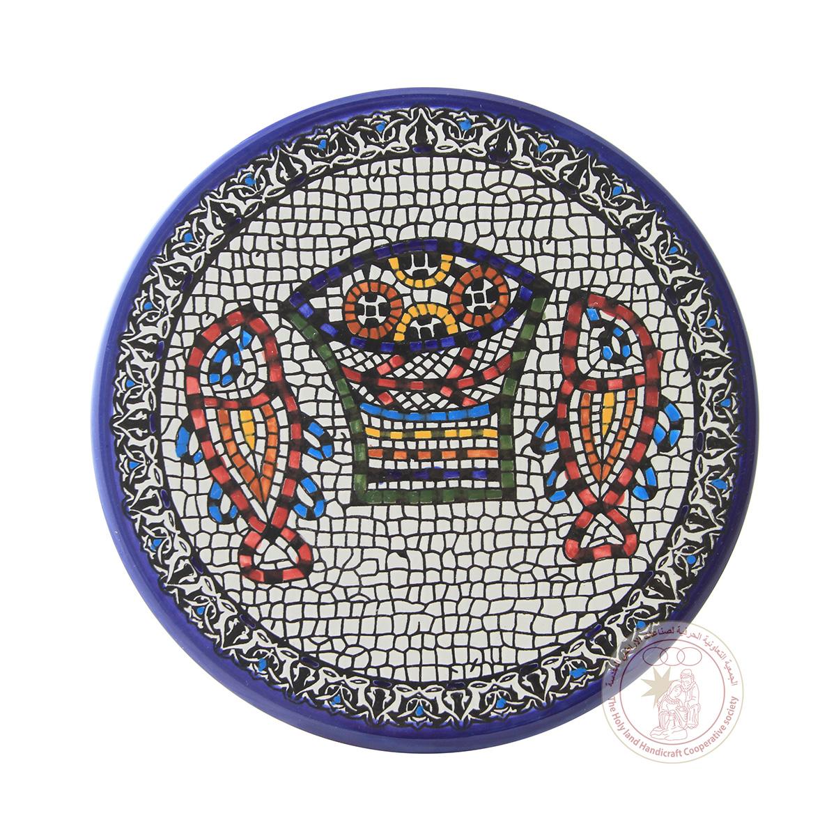 This 13 CM ceramic plate is adorned with a depiction of the famous ancient mosaic of the miracle of the multiplication of the Loaves and Fishes at Tabgha on the Galilee. It was made by ceramic artisans from Hebron.