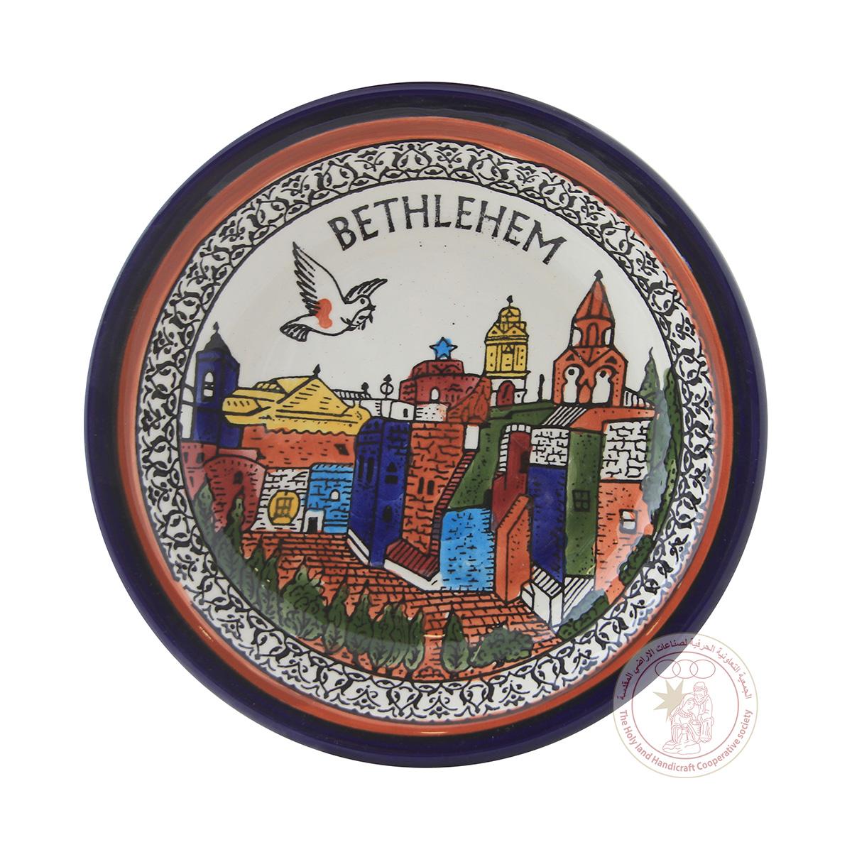 This 12 CM ceramic plate is adorned with an image of Bethlehem, and has a brown border. It was made by ceramic artisans from Hebron.