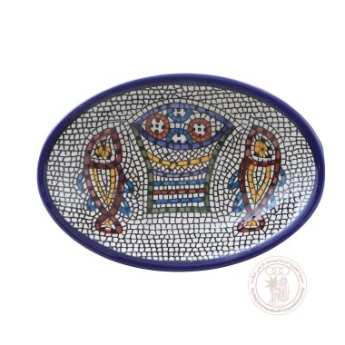 This 17 CM deep oval plate is adorned with a depiction of the famous ancient Tabgha mosaic of the miracle of the multiplication of the Loaves and Fishes at Tabgha on the Galilee. It was made by ceramic artisans from Hebron.