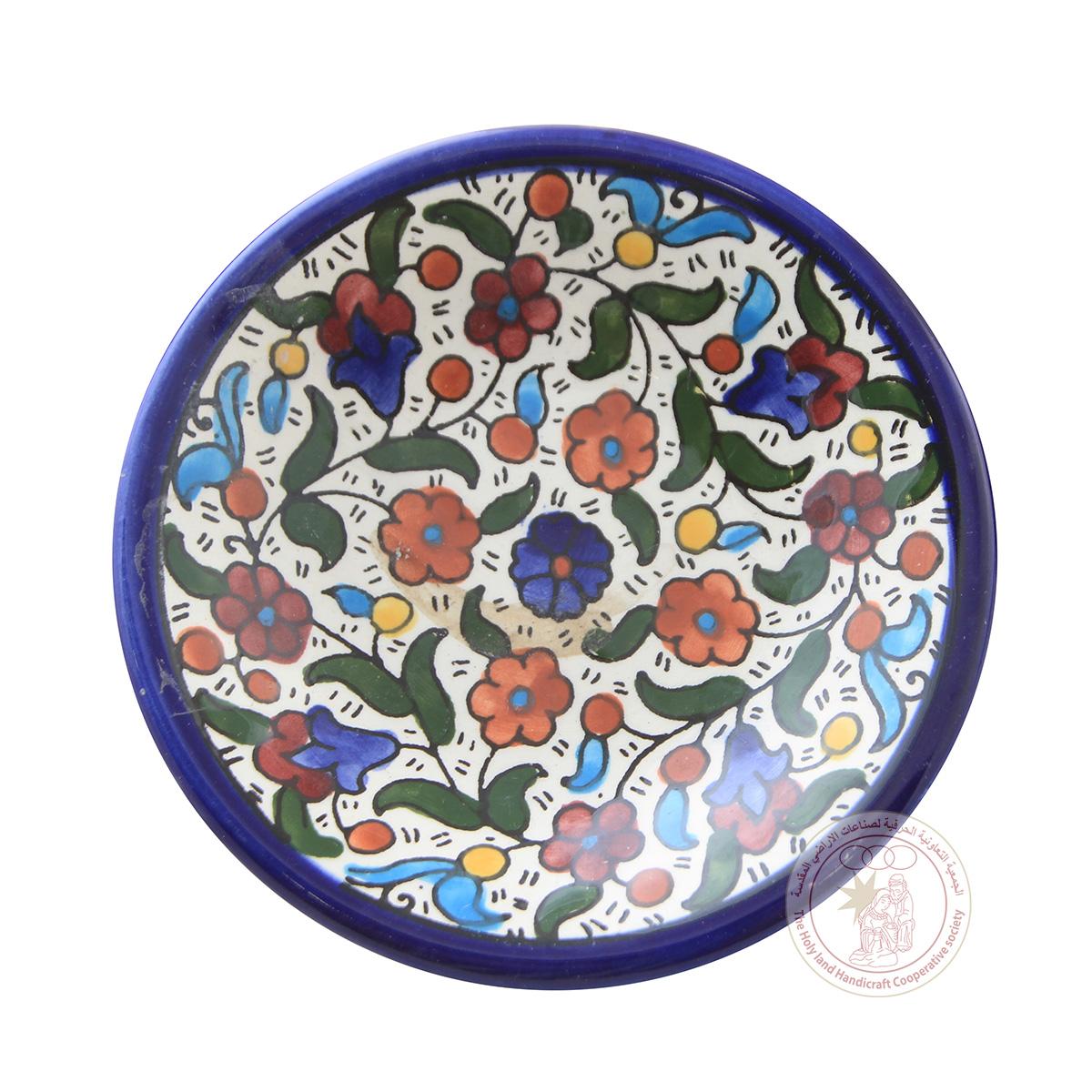 This 9 CM deep bowl is adorned with a multi-colored tulip motif. It was made by ceramic artisans from Hebron.