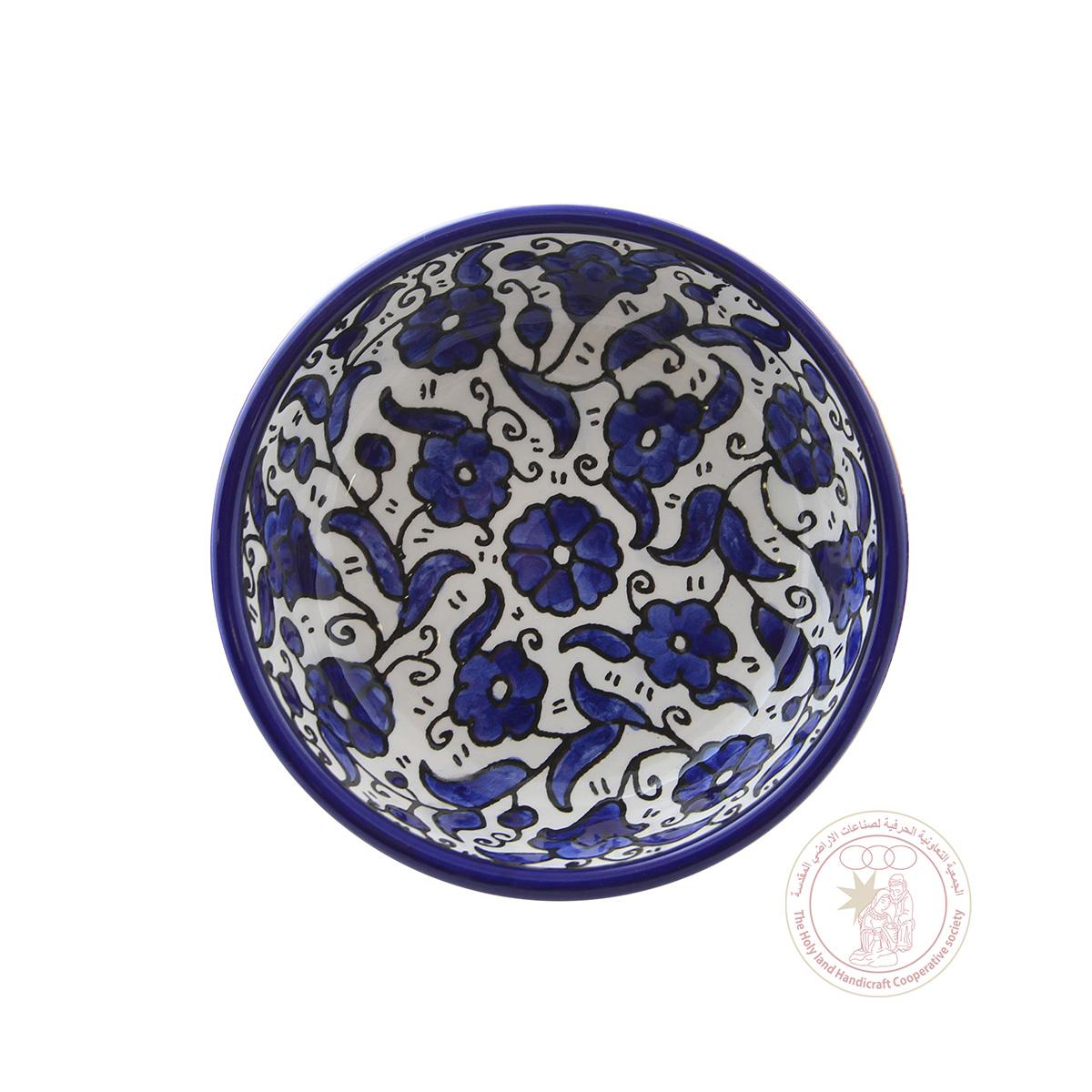 This 13.2 CM deep bowl is adorned with a blue tulips motif. It was made by ceramic artisans from Hebron.