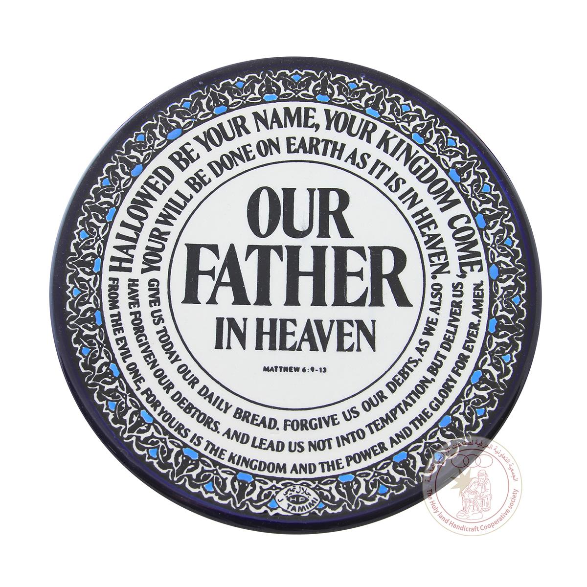 This 13 CM flat plate is adorned with the Lord's Prayer in English, Arabic, French, Spanish, German, Greek and Italian. It was made by ceramic artisans from Hebron.