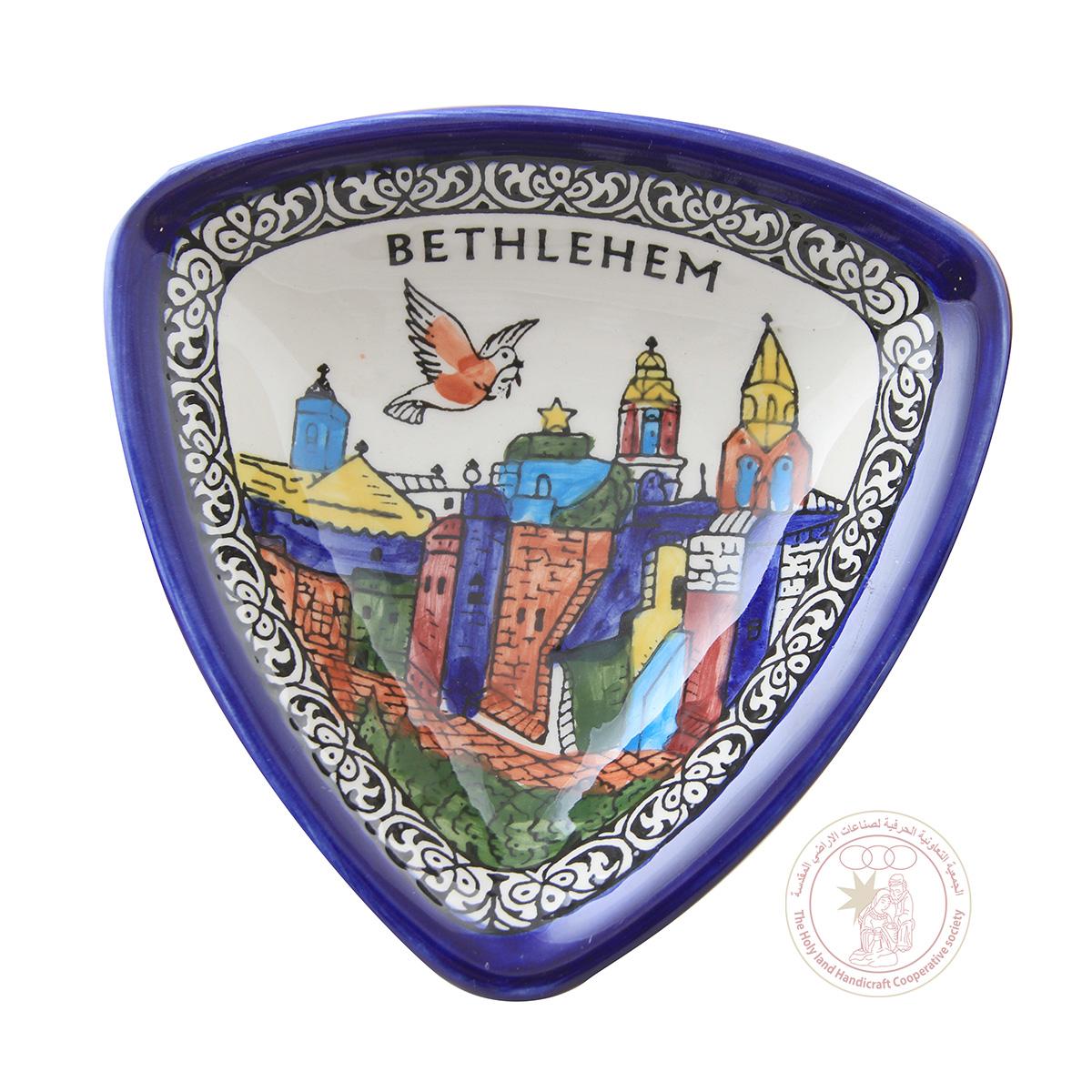 This 16.5 CM triangular bowl is adorned with an image of Bethlehem. It was made by ceramic artisans from Hebron.