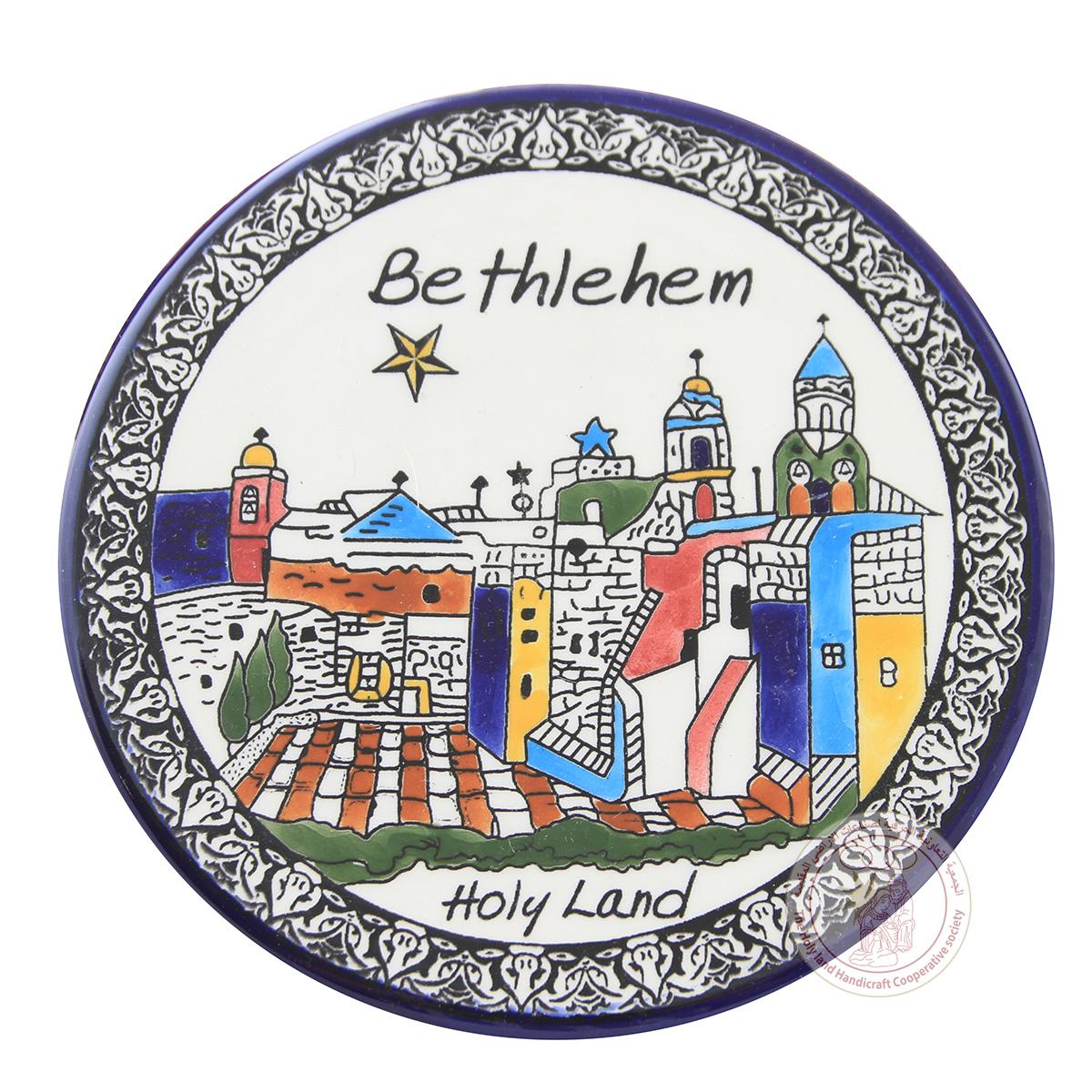 This 16 CM flat plate is adorned with an image of Bethlehem. It was made by ceramic artisans from Hebron.