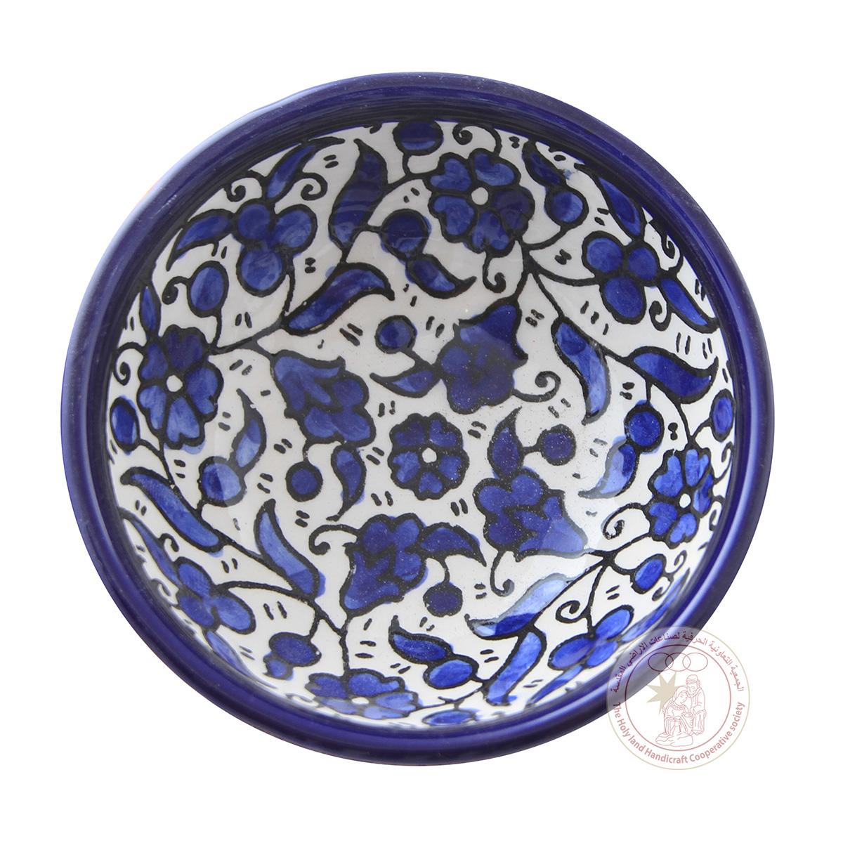 This 9 CM deep bowl is adorned with a blue tulips motif. It was made by ceramic artisans from Hebron.