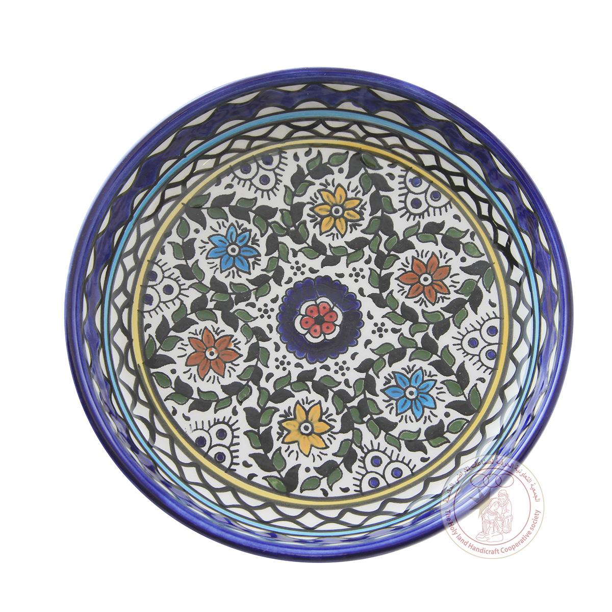 This 28 CM ceramic bowl is adorned with a multi-colored tulip motif. It was made by ceramic artisans from Hebron.