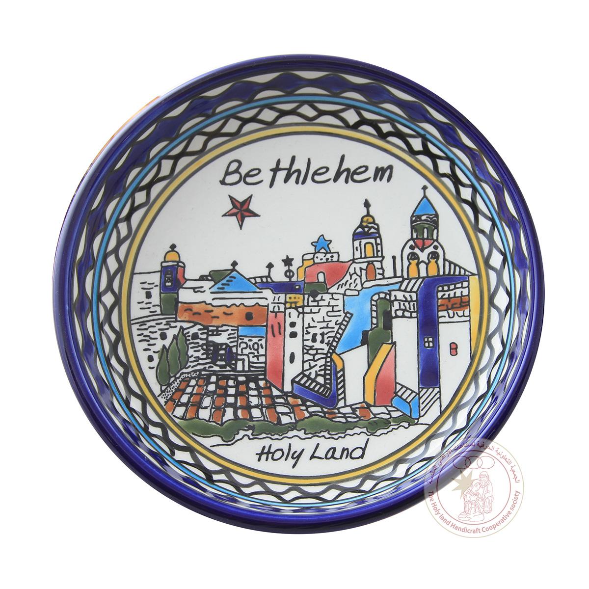 This 28 CM bowl is adorned with an image of Bethlehem. It was made by ceramic artisans from Hebron.