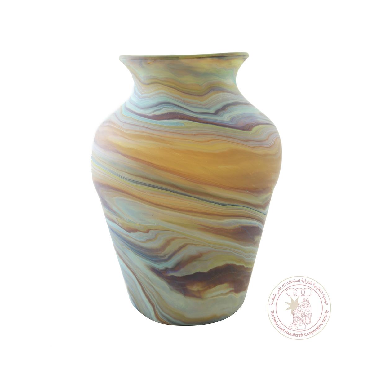 This 20 CM jar is made of swirled-style Phoenician glass, with a color reminiscent of the stones of Petra, and features a wide shape with a short neck. It was made by artisans from Hebron.