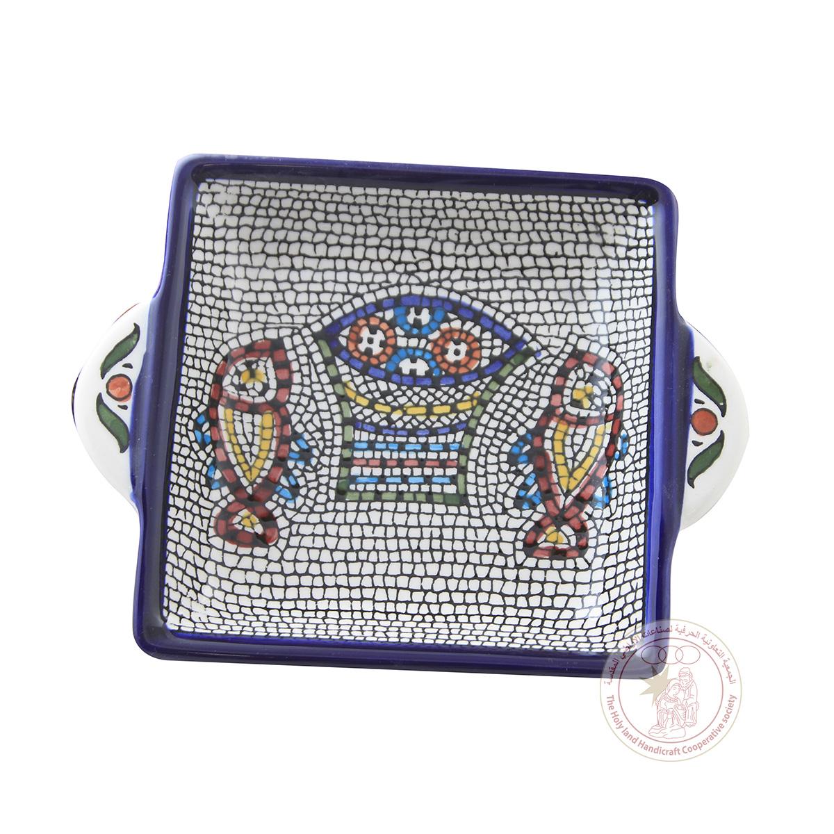 This 15.5 CM tray is adorned with a depiction of the famous ancient mosaic of the miracle of the multiplication of the Loaves and Fishes at Tabgha on the Galilee. . It was made by ceramic artisans from Hebron.