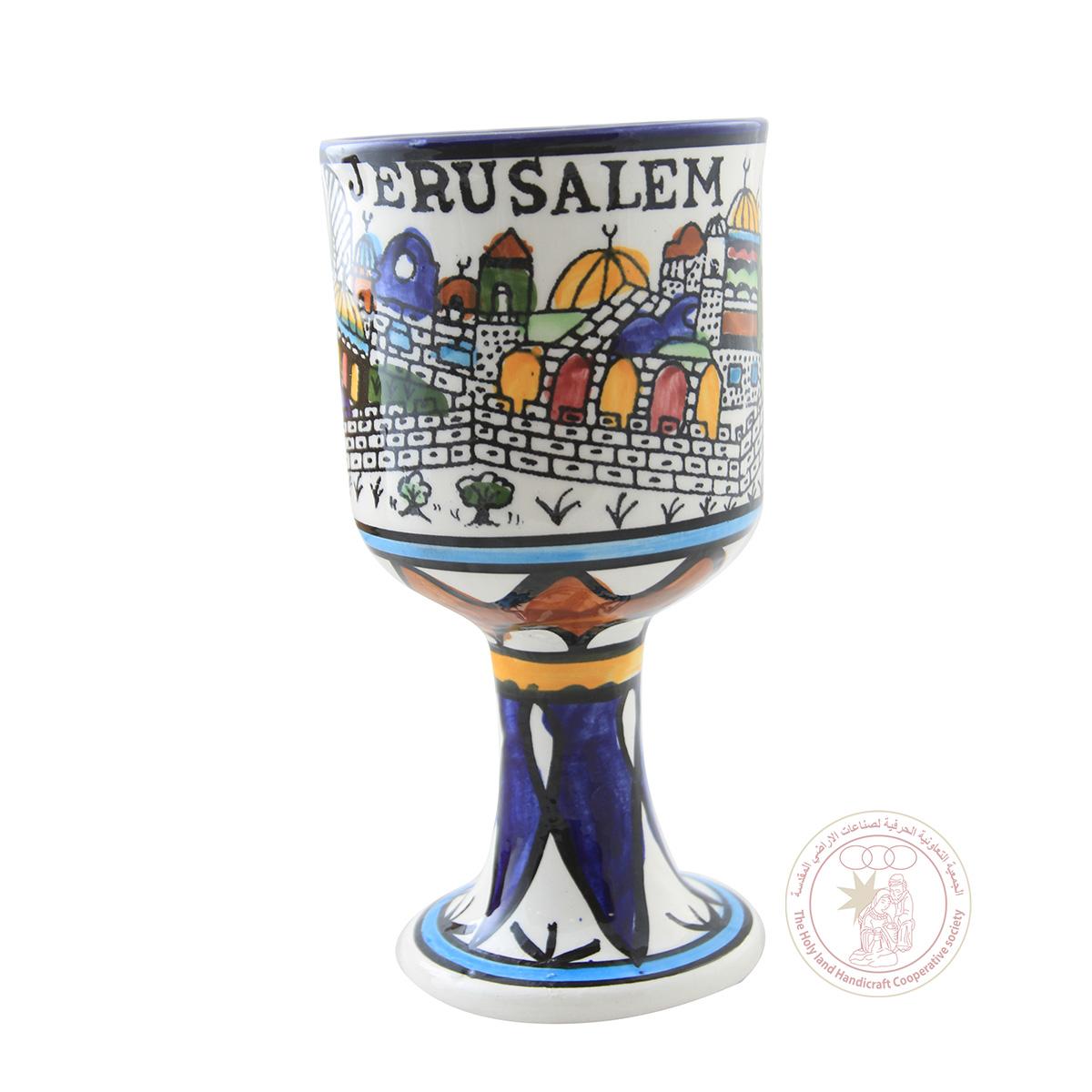 This 16 CM chalice is adorned with an image of Jerusalem. It was made by ceramic artisans from Hebron.
