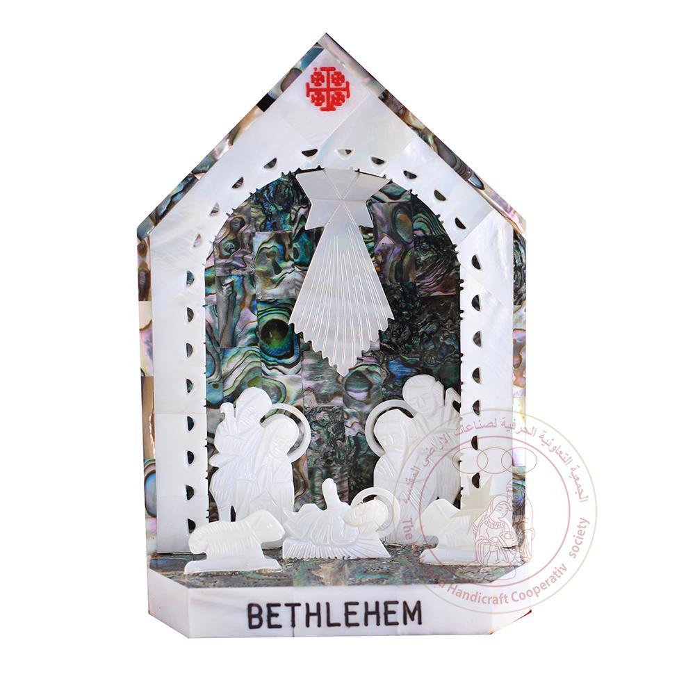 This is a mother of pearl and abalone display depicting the Holy Family in Bethlehem at the time of the Nativity. Made by Bethlehem artisans.