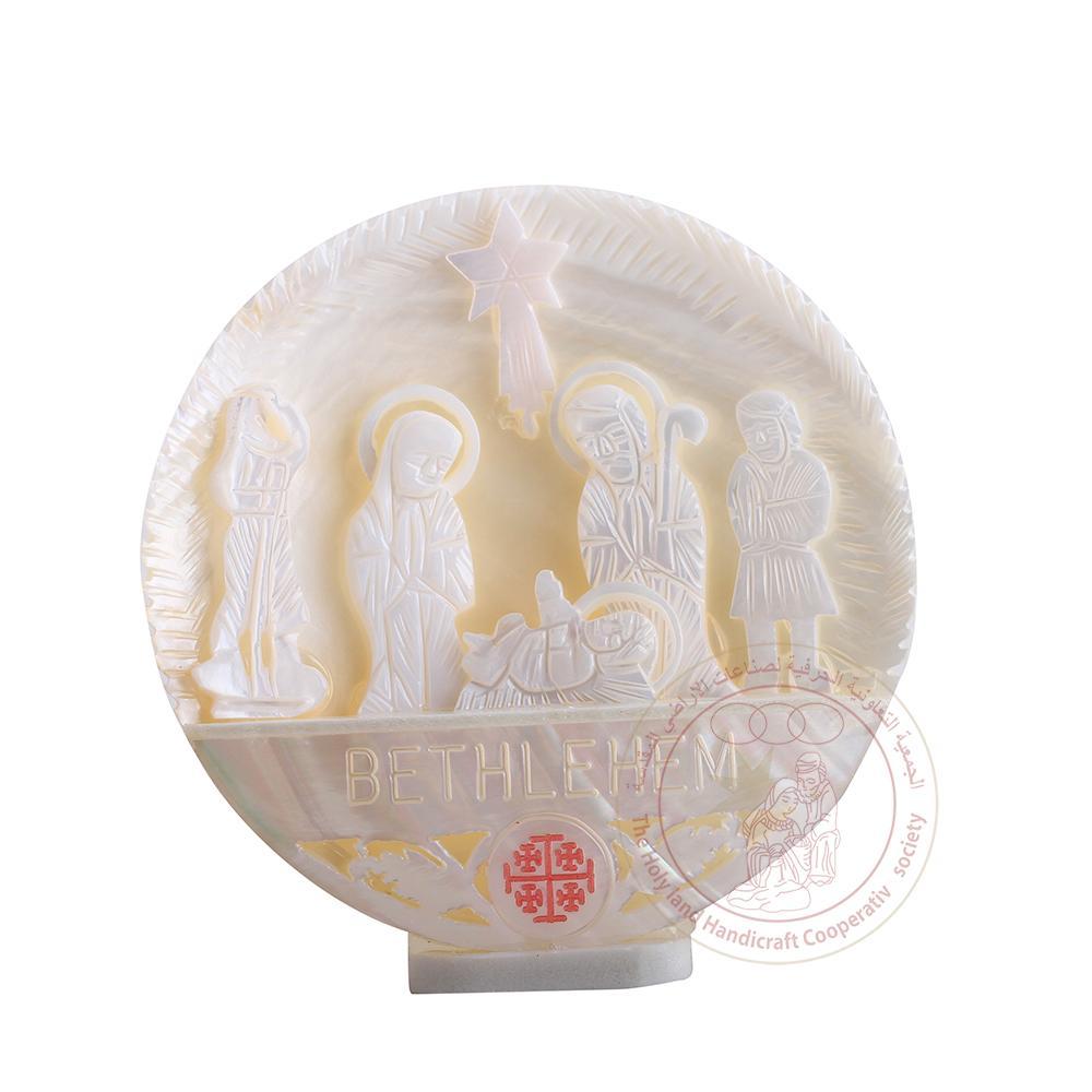 This is a mother of pearl and display depicting the Holy Family in Bethlehem at the time of the Nativity Made by Bethlehem artisans.