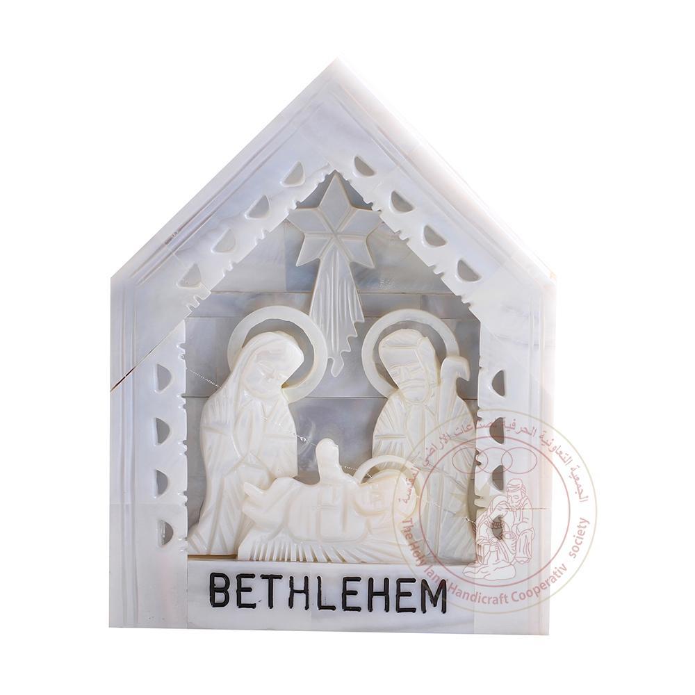 This is a mother of pearl wall hanging depicting the Holy Family in Bethlehem at the time of the Nativity. Made by Bethlehem artisans.
