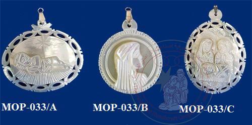 This white-hued mother of pearl pendant depicts the Virgin Mary, and was made by Bethlehem artisans.