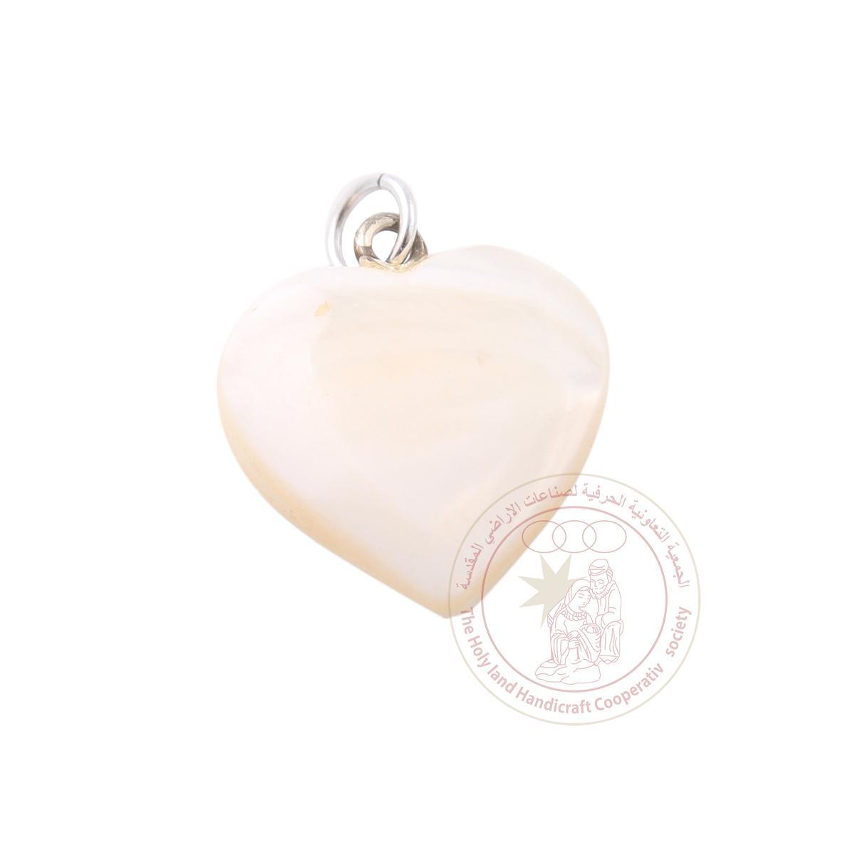 This mother of pearl heart pendant with white-based hues was made by Bethlehem artisans.