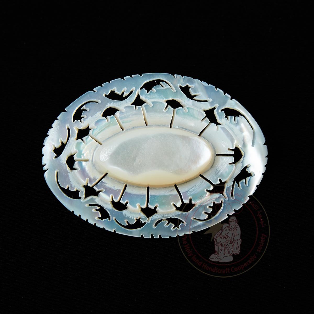 This oval mother of pearl brooch features a design of a flower, and was made by Bethlehem artisans.