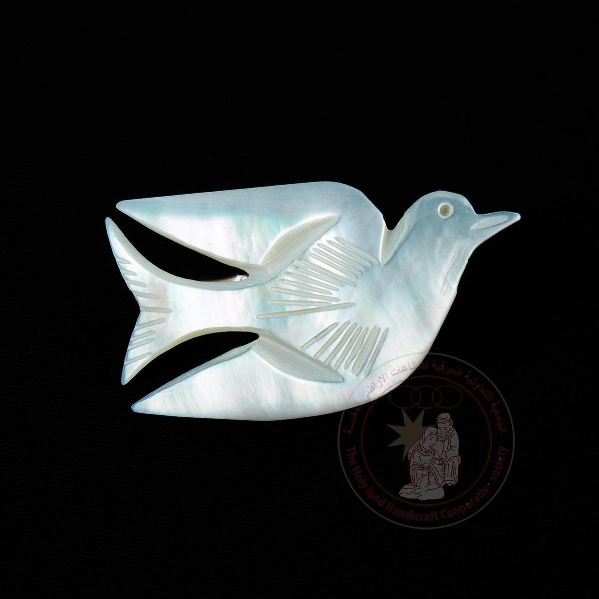 This round mother of pearl brooch features a design of a dove, and was made by Bethlehem artisans.