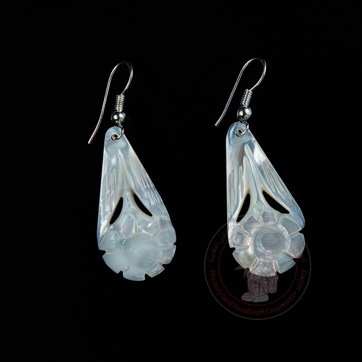 This set of mother of pearl earrings are designed in the shape of teardrop-shaped flowers and were made by Bethlehem artisans.
