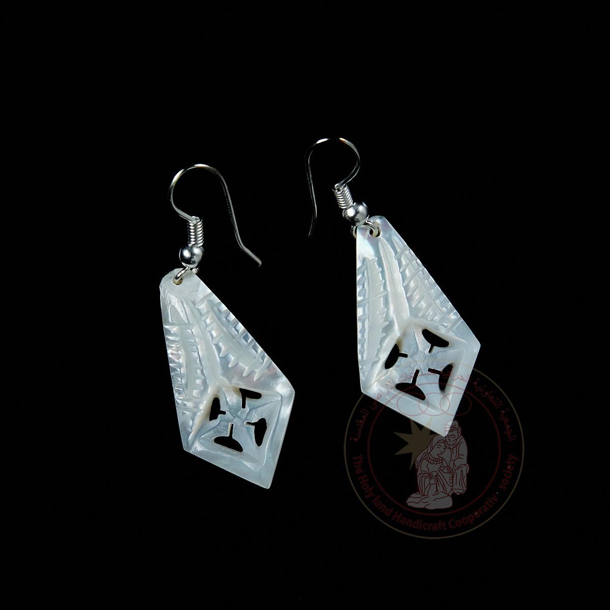 This set of mother of pearl earrings are designed in the shape of leaves with crosses, and were made by Bethlehem artisans.