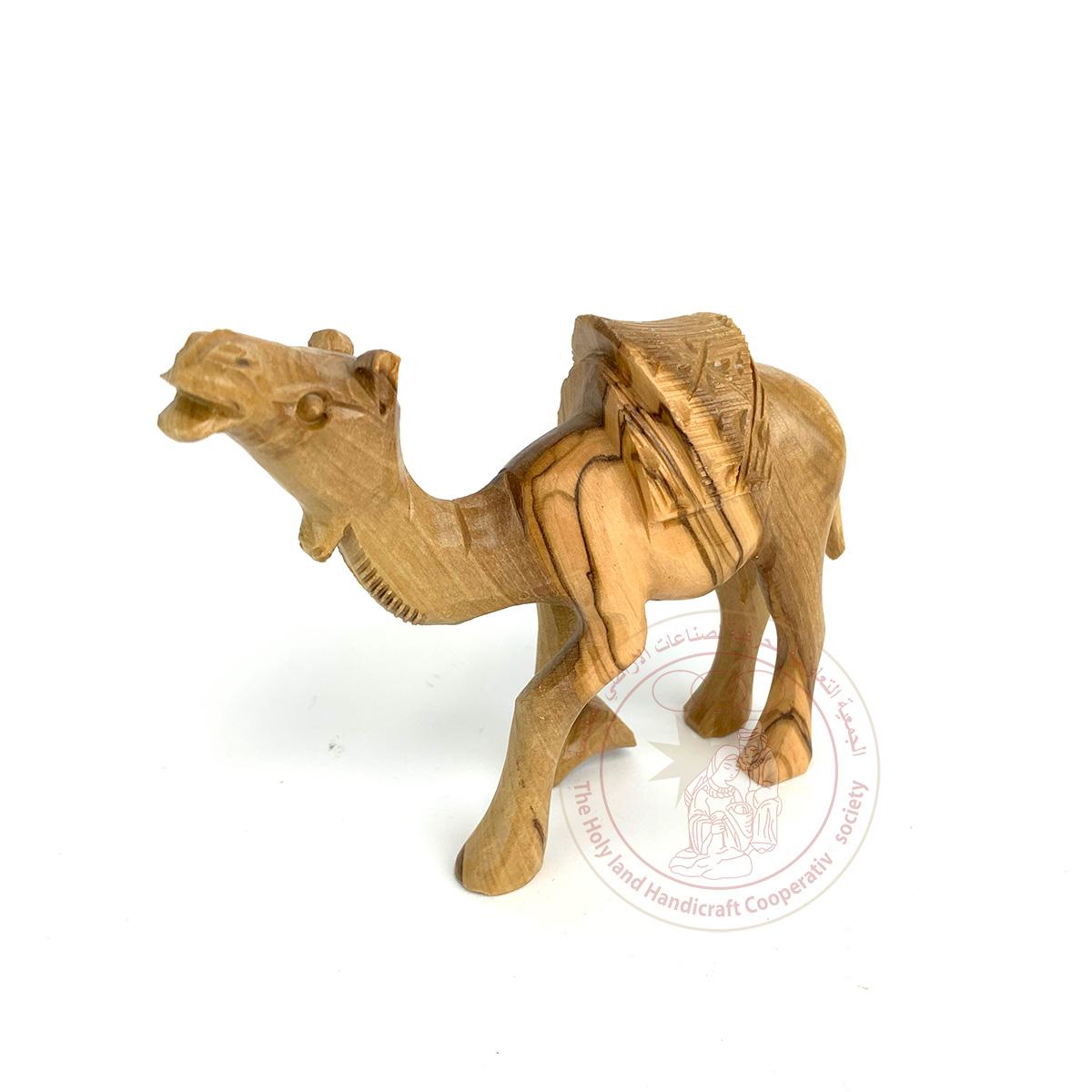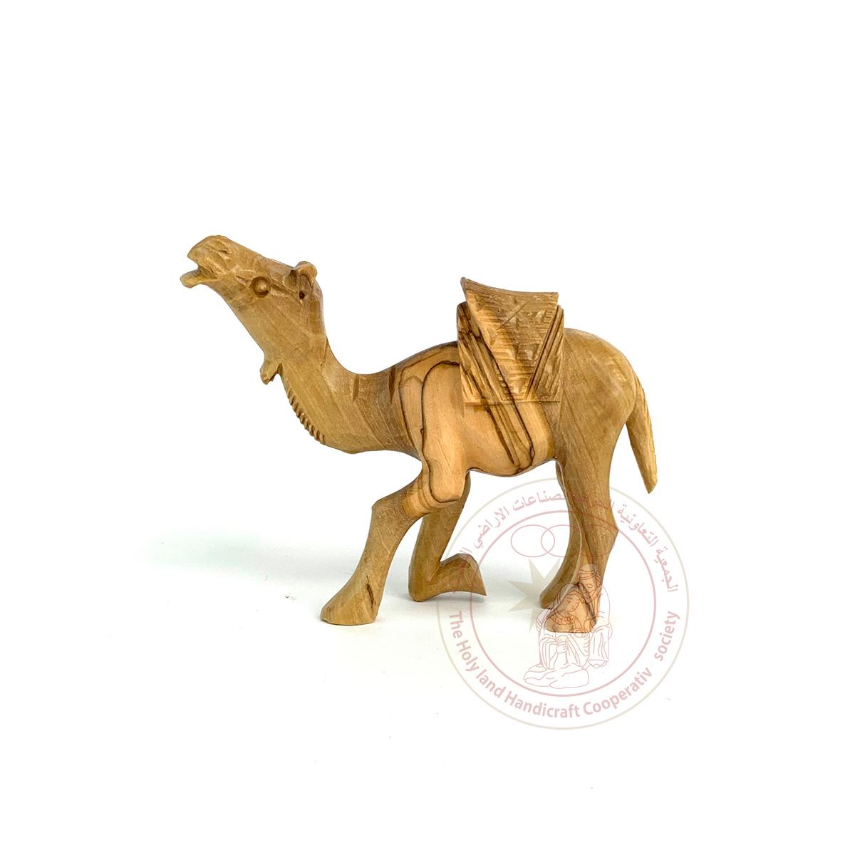 This olive wood camel figurine has detailed features and was made by Bethlehem artisans.