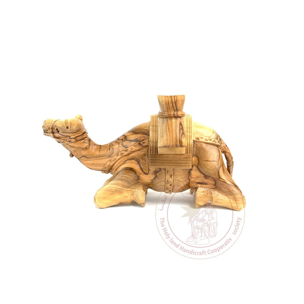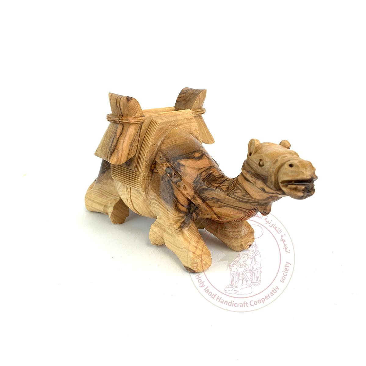 This olive wood camel figurine has detailed features and was made by Bethlehem artisans.