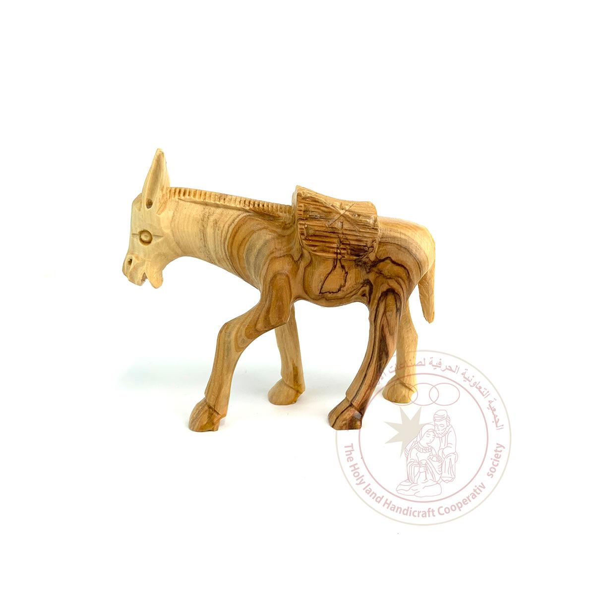This olive wood donkey figurine has detailed features and was made by Bethlehem artisans.