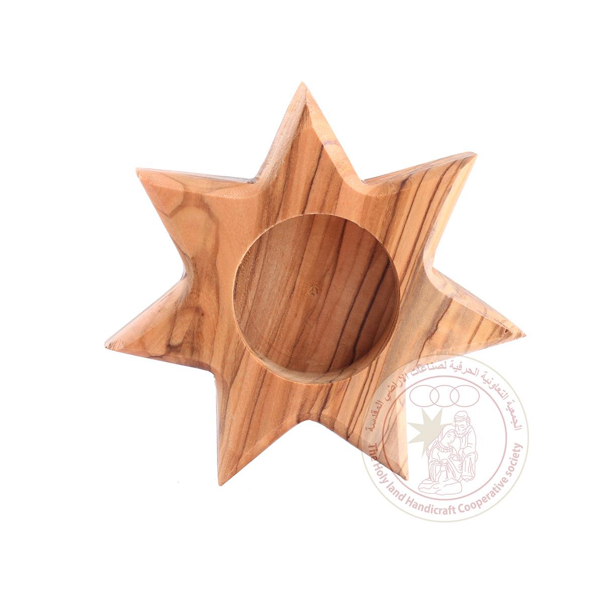 This tea light candle holder is carved in the shape of a star, and is made of olive wood. It was made by artisans from Bethlehem.