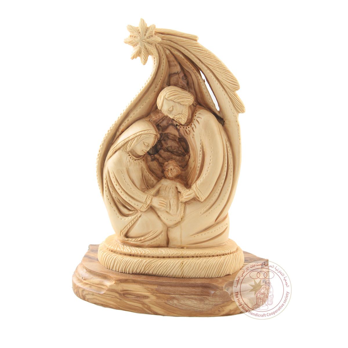 This carved statue depicts the Holy Family enveloped within the Star of Bethlehem. It was carved in Bethlehem from Holy Land olive wood.