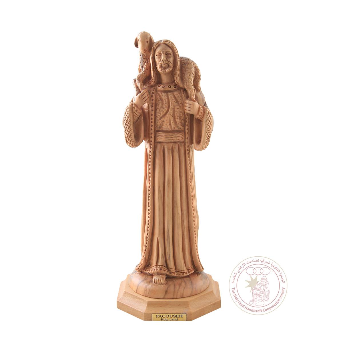 This carved statue depicts Christ as the Good Shepherd from the parable recalled in the Gospel of John. It was carved in Bethlehem from Holy Land olive wood.
